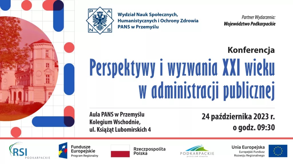 Mam przyjemność zaprosić Państwa do wzięcia udziału w konferencji pt. „Perspektywy i wyzwania XXI wieku w administracji publicznej”. Partnerem wydarzenia jest Województwo Podkarpackie. Konferencja odbędzie się 24 października 2023 roku (rozpoczęcie godz. 9.30) w siedzibie Państwowej Akademii Nauk Stosowanych w Przemyślu (Kolegium Wschodnie, ul. Książąt Lubomirskich 4).