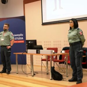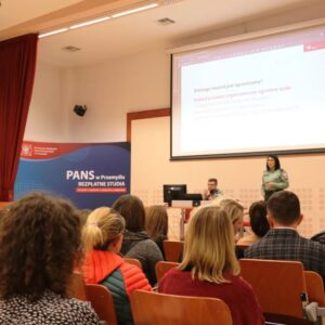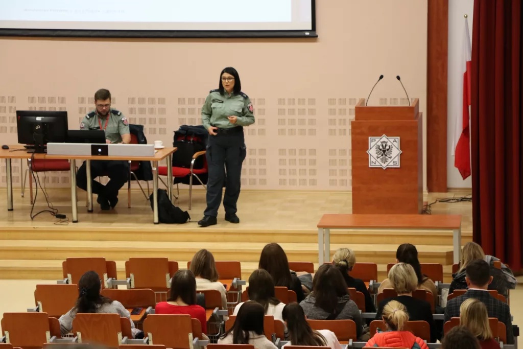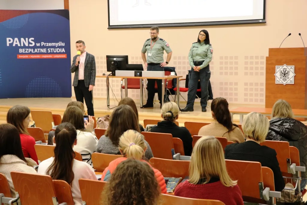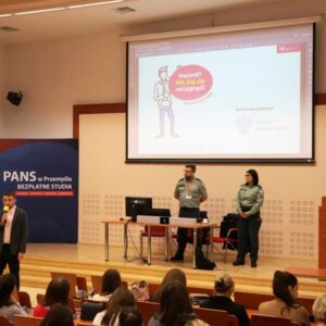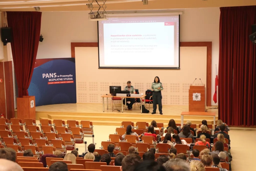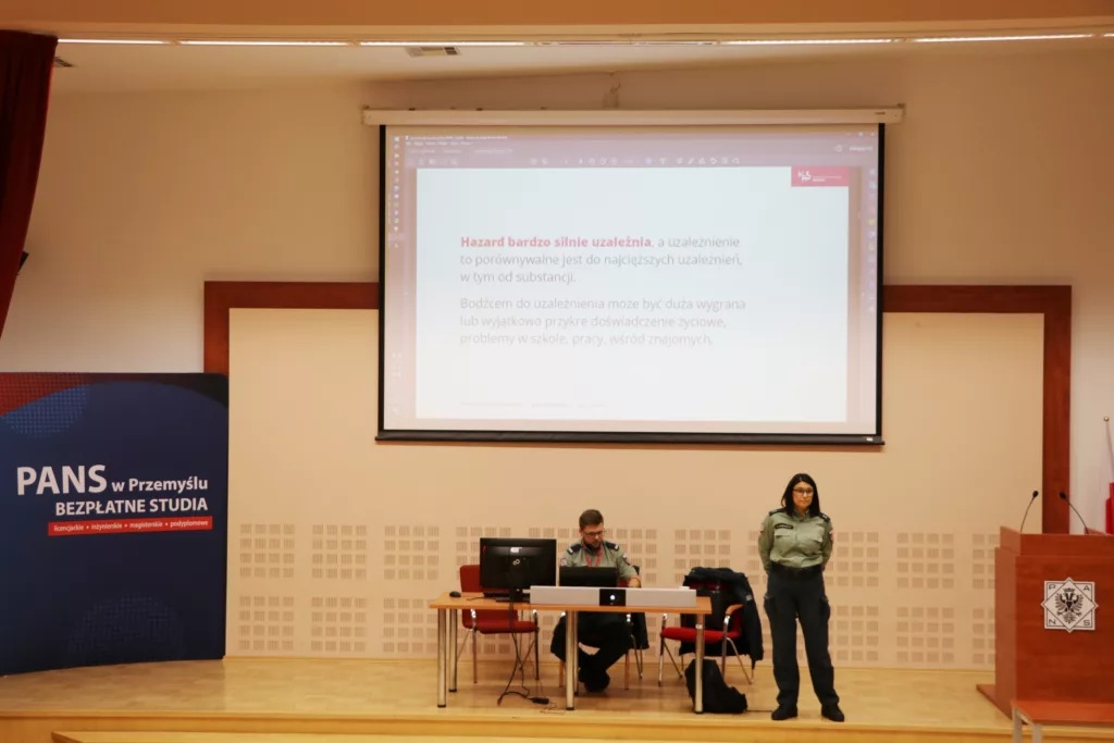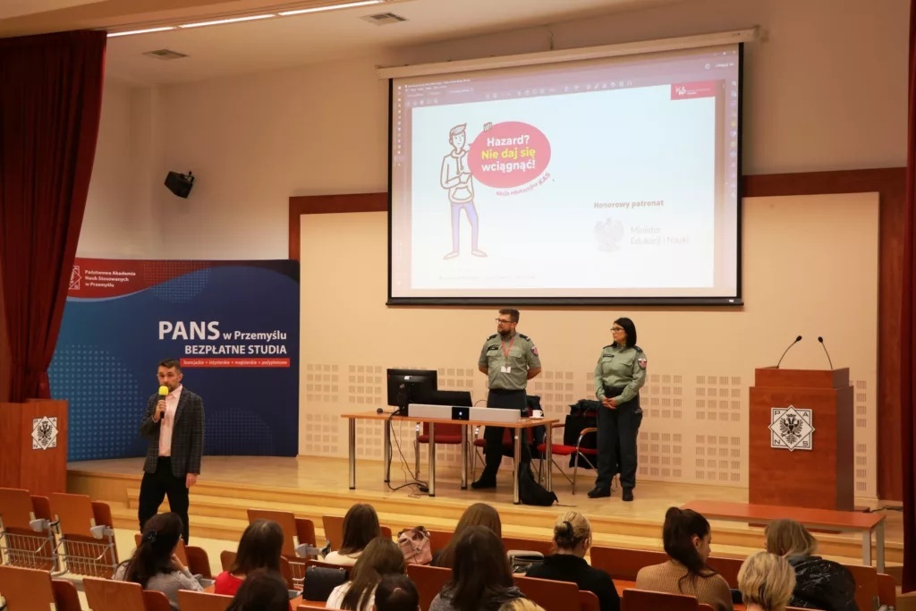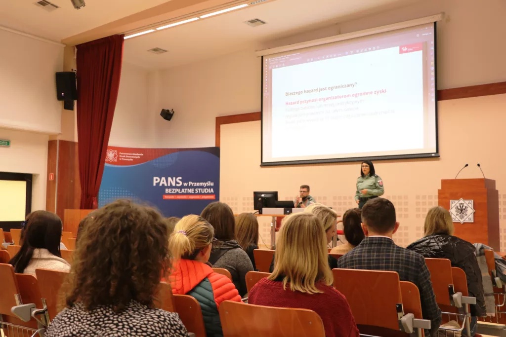 Profilaktyka, czyli podejmowanie działań, które mają na celu zapobieganie pojawieniu się lub rozwojowi zaburzeń, chorób lub innych niekorzystnych zjawisk społecznych, to dla przemyskiej Uczelni, która jest instytucją społecznie odpowiedzialną, swego rodzaju norma. O wspomnianym zaangażowaniu i gotowości do działania przypomniał Prorektor ds. studenckich Państwowej Akademii Nauk Stosowanych – dr Robert Oliwa, witając prelegentów – Podkomisarz Anetę Czarnecką i młodszego rewidenta Krzysztofa Tęczę ze Służby Celno-Skarbowej w Rzeszowie oraz zgromadzonych słuchaczy. A ci dowiedzieli się, czym jest uzależnienie od hazardu, jakie cechy wskazują na to uzależnienie, jakie są rodzaje gier hazardowych i kto może w nich uczestniczyć, co grozi za nielegalny hazard oraz gdzie szukać pomocy w zakresie uzależnienia.