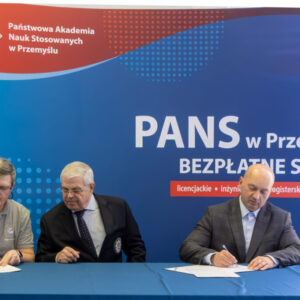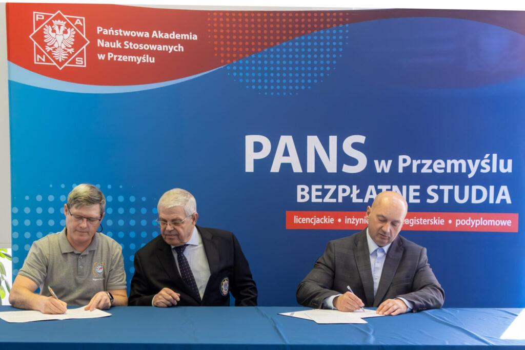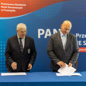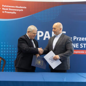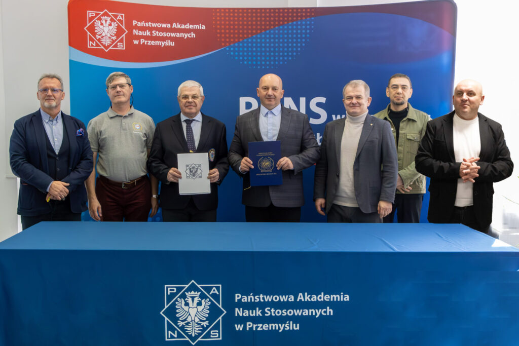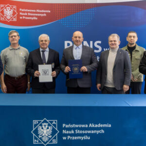 Bezpieczeństwo, edukacja i współpraca – to trzy hasła, które najlepiej oddają ducha nowego porozumienia zawartego pomiędzy Państwową Akademią Nauk Stosowanych w Przemyślu a Przemyskim Regionem Międzynarodowego Stowarzyszenia Policji IPA. Oficjalne przypieczętowanie współpracy odbyło się 27 października br. w uczelnianych murach, przy udziale: JM Rektora – dr. hab. Marka Delonga, prof. PANS, Prorektora ds. studenckich dr. Andrzeja Kaweckiego, prof. PANS, Kanclerza PANS – mgr. Dominika Tracza, Dziekana Wydziału Nauk Społecznych, Humanistycznych i Ochrony Zdrowia PANS – dr. Pawła Łabuza, Dyrektora Instytutu Nauk Społecznych i Humanistycznych – dr. Tomasza Olejarza, prof. PANS oraz Jana Fabera – Przewodniczącego Przemyskiego Regionu Międzynarodowego Stowarzyszenia Policji IPA i Wojciecha Skorży – Sekretarza Prezydium Przemyskiego Regionu IPA.